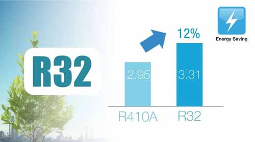 Menggunakan refrigeran R32 dengan kemampuan perpindahan panas lebih optimal dibandingkan R410A, sehingga mampu meningkatkan efisiensi energi hingga 12%. Solusi tepat untuk penggunaan listrik yang lebih hemat dan ramah lingkungan.