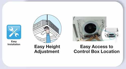 AC Cassette Daikin ini dilengkapi pengatur ketinggian di setiap sudut untuk penyesuaian yang fleksibel. Control box dirancang lebih mudah diakses langsung dari grille intake, mempercepat proses instalasi maupun perawatan tanpa perlu membongkar panel.